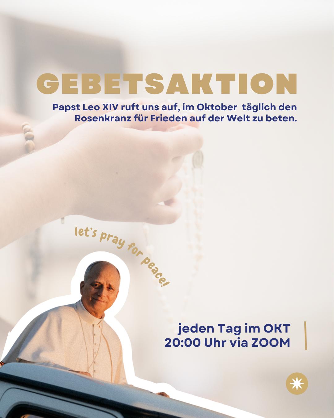 Papst Leo XIV hat dazu aufgerufen, im Oktober täglich den Rosenkranz für den Frieden zu beten. Dafür treffen wir uns täglich um 20 Uhr online per Zoom.