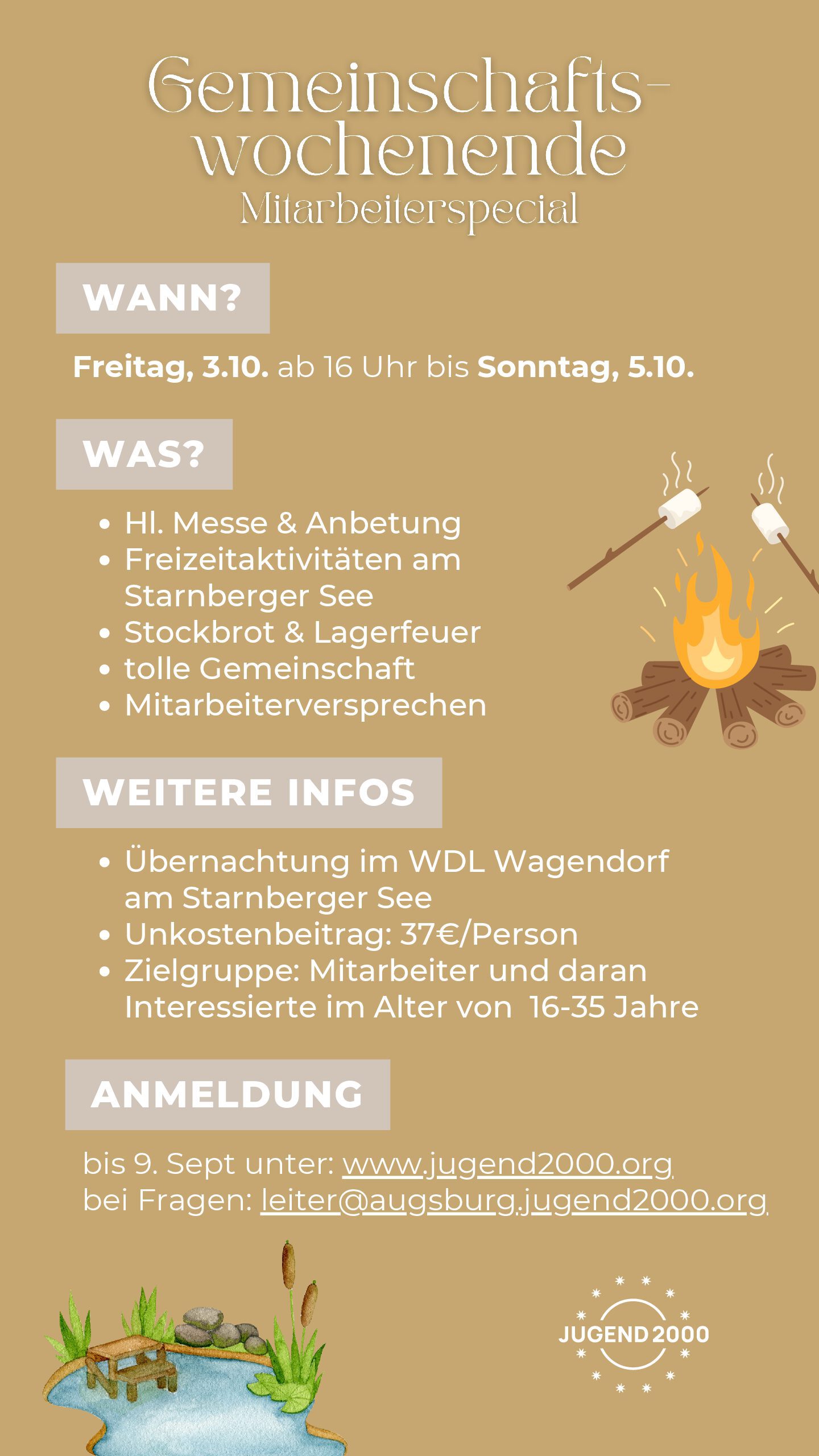 Dich erwarten an diesem Wochenende verschiedene Freizeitaktivitäten am wunderschönen Starnberger See, viel Zeit in Gemeinschaft mit anderen Jugendlichen und jungen Erwachsenen, Stockbrot & Lagerfeuer, Anbetung, Input und noch vieles mehr.
