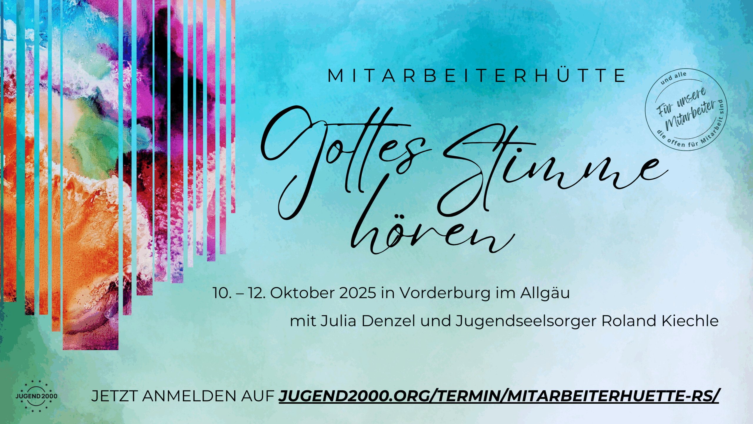 Wenn du dich bereits in unserer Bewegung engagierst oder reinschnuppern möchtest und dir vorstellen kannst, dich gerne auch selbst im Rahmen deiner Möglichkeiten einzubringen, dann freuen wir uns, mit dir dieses Wochenende zu erleben und in die Spiritualität der JUGEND 2000 einzutauchen.